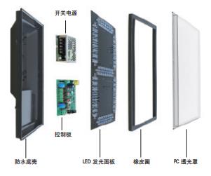 顯示單元由防水底殼、PC透光罩、橡皮圈、LED發(fā)光面板、控制板、開關(guān)電源、密封條等組成,單元密封性好,密封表面平整外殼采用工程塑料一次性注塑成型。